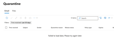 I've had this issue open with Microsoft Support for more than two weeks and they have still not resolved. Two weeks ago, without reason, I was suddenly unable to see data in quarantine. https://security.microsoft.com/quarantine