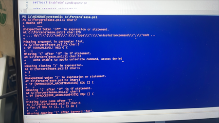 What you describe does seem unexpected, but regarding the errors: this is a Windows cmd script, not a powershell script, try running it in a classic Command Prompt window aka cmd.exe.