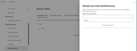Hello,  I wanted to exclude some user from the cloud discovery data but it won't find any matches. I also tried some usernames and email adresses, that were in the Cloud Discovery dashboard, but it ...