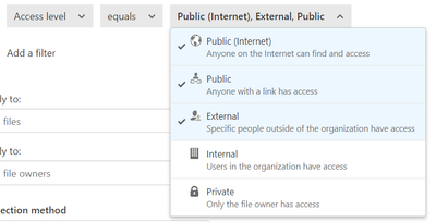 Petri Helin - you can filter by properties of the file. For example, you can create a File Policy that matches a file that's externally shared, when it was last modified, the mime type, file type, file name, etc. You can even filter by labels.