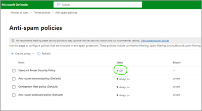 - We recommend enabling preset security policies for your organization: Steps to quickly set up the Standard or Strict preset security policies for Microsoft Defender for Office 365 - Office 365 | Microsoft Learn