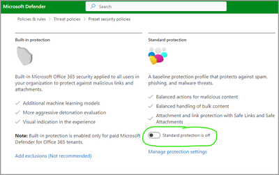 - Specific controls set in Preset Security Policies: Microsoft recommendations for EOP and Defender for Office 365 security settings - Office 365 | Microsoft Learn