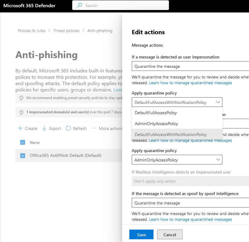 If your organization has enabled preset security policies, these will be automatically updated to include the quarantine notification policies (DefaultFullAccessWithNotificationPolicy) as listed in the above table for the standard and strict protection preset profiles.