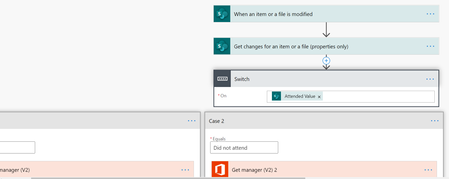 My flow is simpler than yours in that you don't need a Switch as there are only 2 outcomes for the attended column, Attended or Did Not Attend, so you can use a Condition. Also, you only need 1 Get Manager (V2) which you can use earlier in the flow. And you only need 1 Send an email action. So the flow looks like this: