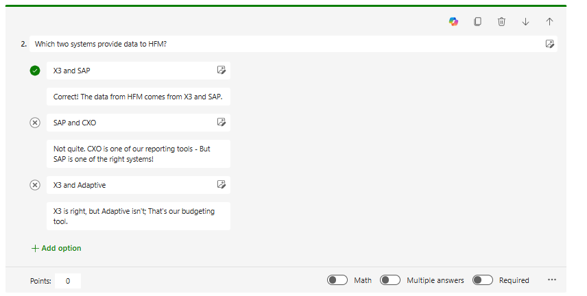 In Practice Mode, Microsoft Forms currently does not support displaying custom messages for correct or incorrect answers. Even though the interface shows a field for custom messages, those messages only appear in standard quiz mode, and even then, only after submission, not during the question-by-question flow in practice mode.