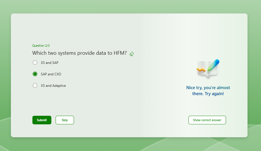 Creating a quiz form to do a knowledge check, and putting it in practice mode to prevent people from moving on to the next question until they get it right. If possible, I'd like to do custom messages guiding the user to the right answer, but there doesn't seem to be any way to customise this message; It just gives the same 'Nice try, you're almost there.'