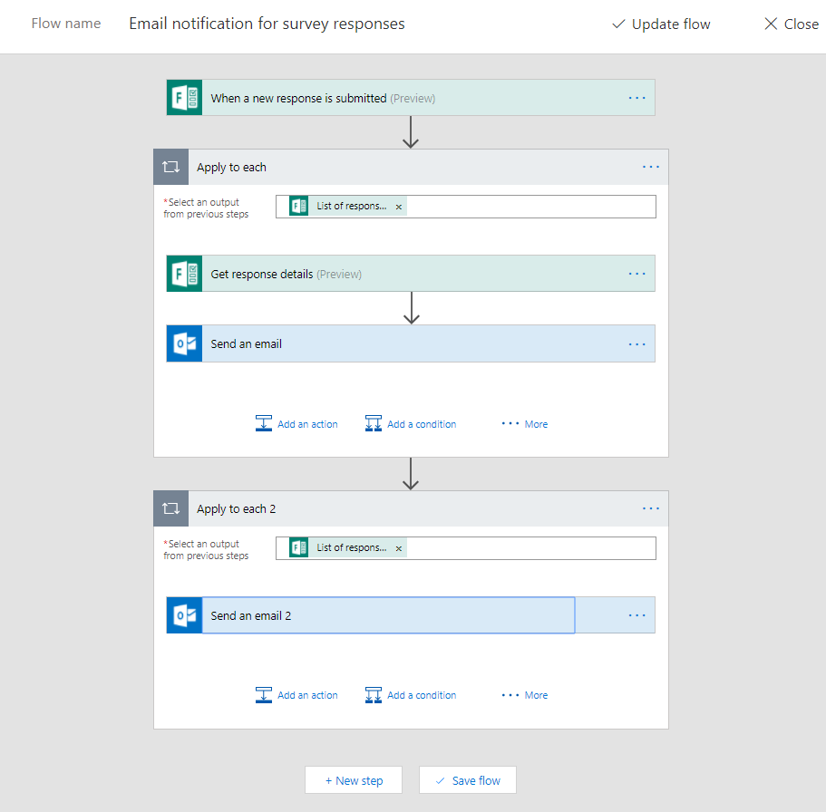 See how your email action is inside the "Apply to Each" box? Add your email action below that (don't remove the one you have now, though).