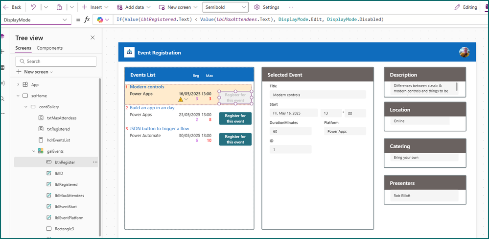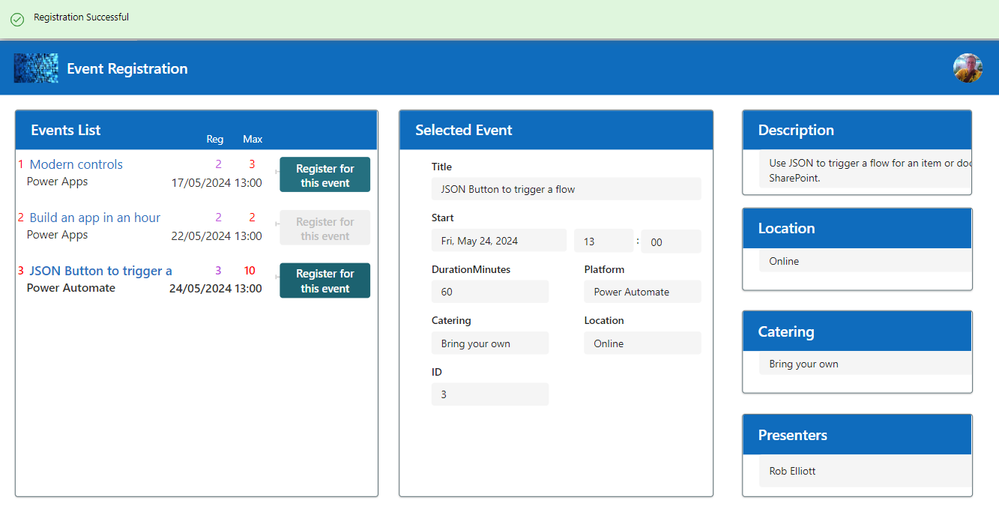 The events list is in a gallery down the left side. The user selects one of the event titles to see the details which are displayed in various containers and then if the number of attendees (shown as Reg in the screenshot) is less than than the maximum (Max) then they click the button.