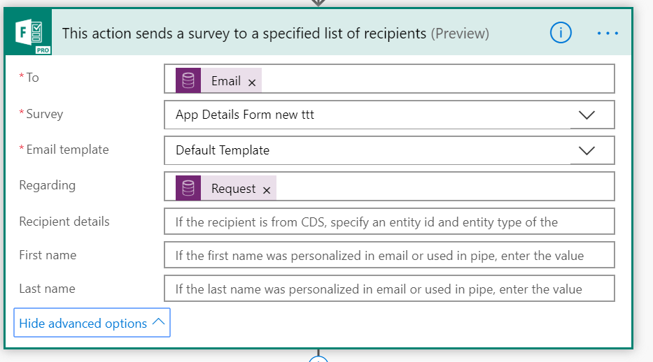 I am making use of Forms Pro connector in flow and populating 'Regarding' field while sending the survey. I would like to receive the value of 'Regarding' field while capturing the response. Please refer to the attached screenshots.