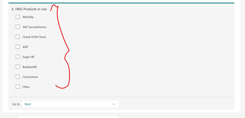 Question type is choice where user can select "Multiple Answers" and based on selected answer, subsequent question should be visible.