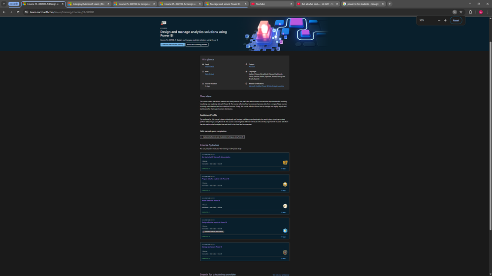 I completed the course - Course PL-300T00-A: Design and manage analytics solutions using Power BI
