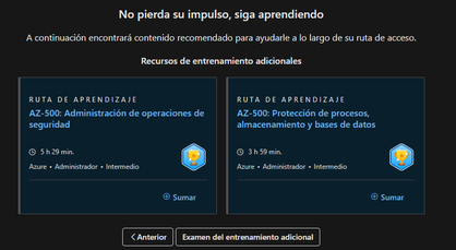 Hello, I write to you for a doubt about the certification exam, yesterday I finished a learning path of 4 modules called "AZ-500: Identity and access management" and at the end, I think there was already examination and I take this, I give it where it says "Personal training examination" and it leads me to that, which I have to do now, keep doing routes and modules or if there is an exam? I am lost (Sorry, the screenshots are in Spanish)