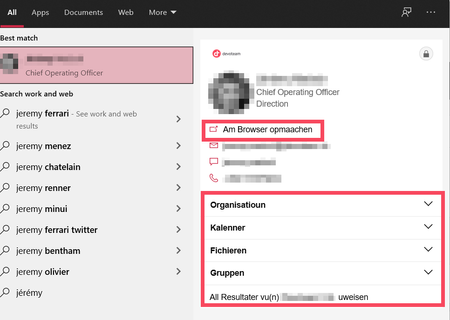 Hi, I have some language discrepancy while searching for Office 365 info on Windows 10. As you can see here some part of the search results appear in Luxemburgish: The language of my...