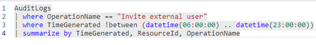 AuditLogs | where OperationName == "Invite external user" | where hourofday(TimeGenerated) !between (6 .. 22)
