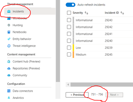 // Show count for last 30days SecurityIncident | where TimeGenerated > ago(30d) | summarize count() by IncidentNumber, IncidentName, Title , Severity // daily count from midnight 30days ago SecurityIncident | where TimeGenerated > startofday(ago(30d)) | summarize count() by bin(TimeGenerated,1d) | order by TimeGenerated asc //| render columnchartFor each SecurityIncident there will be a SecurityAlert entry, but there could be more than one Alert - so the SecurityAlert count is often higher? e.g. This single Incident 10725 has three Alerts