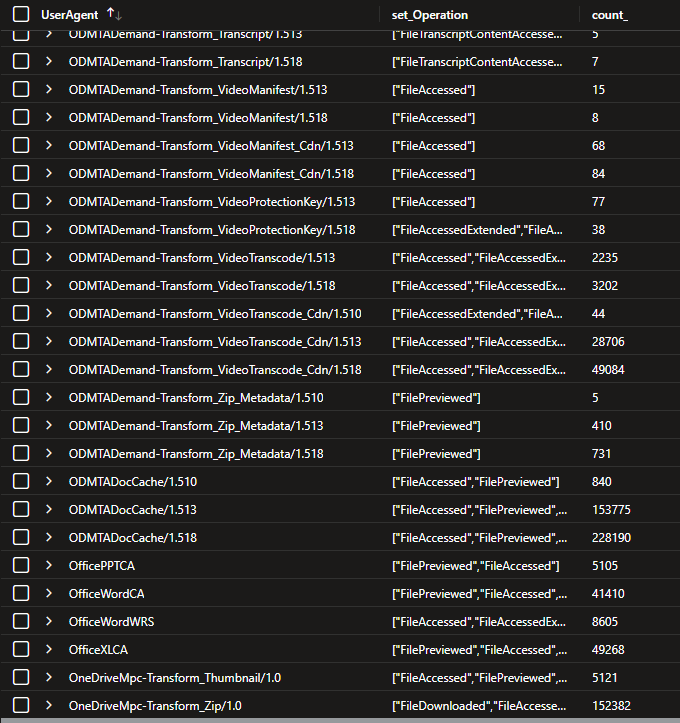 That's a good point, we see the same.. FileDownloaded operations are OneDrive, while other operations look like variations of OneDrive user agents or Office, which I imagine is doing the same thing