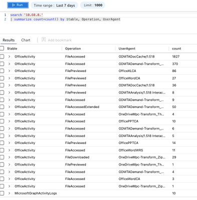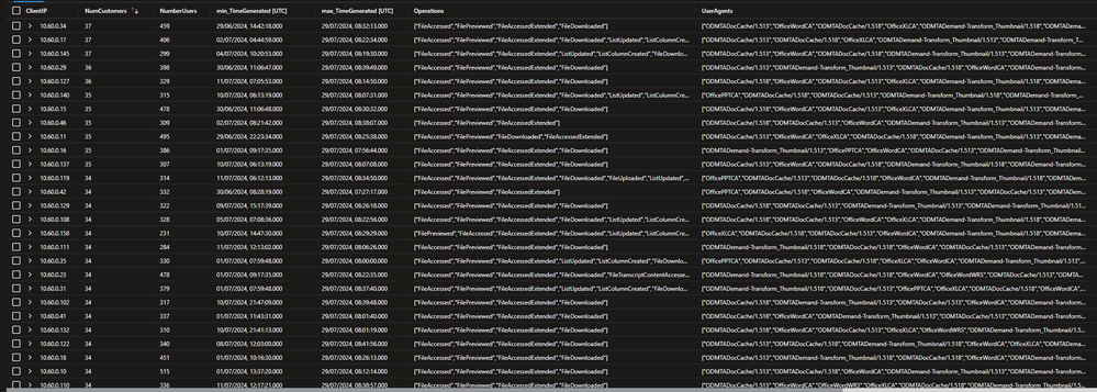 | summarize min(TimeGenerated), max(TimeGenerated), Operations=make_set(Operation), NumberUsers=dcount(UserId), make_set(UserId), UserAgents=make_set(UserAgent) by ClientIP