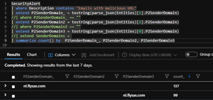 SecurityAlert | where Description contains "Emails with malicious URL" | mv-expand todynamic(Entities) //| summarize make_set(Entities.P2SenderDomain) | where isnotempty(Entities.P2SenderDomain) | distinct tostring(Entities.P2SenderDomain)or