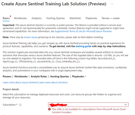 I am planning to install Azure Sentinel Training Lab Solution in my environment so I can use it to demo to the clients, however it is giving below error. Can any one guide, how can i get it installed??
