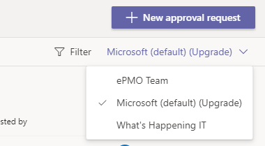 Hello, When viewing the Approvals app tab in Teams I see a drop-down list in the upper right corner that says “Microsoft (default)(Upgrade). On selecting it I see two teams listed as shown in the im...