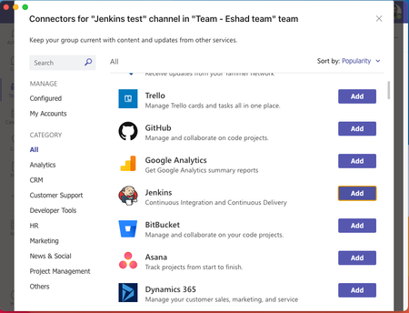 After creating new team and creating new channel under this team i was trying to add jenkins connectors but when i clicked "add" button there were no response and the screen was stuck at similar stat...