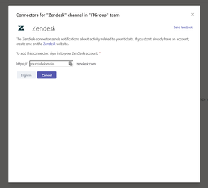 I am trying to add Zendesk connector (not tab) to a team channel. It shows the URL that I need to enter. After clicking on sign in button, i have to enter username and password. Then it goes ba...