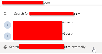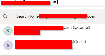 Problem should not be with external access since my organization can chat with other external contacts in that external organization. Example of another contact -> I can choose to chat with External or Guest user.