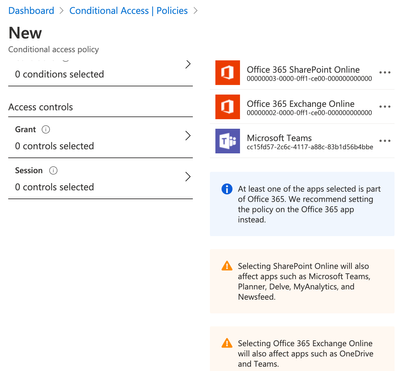 CA is in a bit of a transitional phase with M365 apps I feel. There is now the Office 365 (Preview) and also Teams available, but the issue you may find is that you have SharePoint Online and Exchange Online selected in a CA policy, then as a consequence you will also be affecting Teams as shown below.