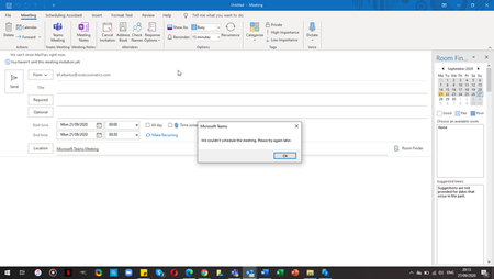 Hello, can anyone help me. I would like to plan a Teams meeting from Outlook but I keep getting an error and pop-up with the following message "We couldn't schedule the meeting. Please try again lat...