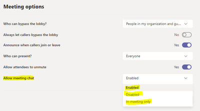 This appeared in our tenant today; however, In meeting doesn't seem to work like it's worded, when it's set to this, only the Organizer can chat, but no presenters or attendees. BUT it does mean that it can be disabled to stop chat after the meeting is done.