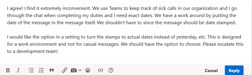 We use screenshots of Teams messages in our processes, and having to wait for the actual date to displayed invariably means taking the screenshot is forgotten.