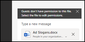 In private meetings by default internal users can share files with all participants - in theory - in fact a new message where users can change the file permissions to "People currently in this chat". From my testing however this is not the case. Access is granted only to users that are existing guests. External users that have been invited with their email address will not be able to access the file.