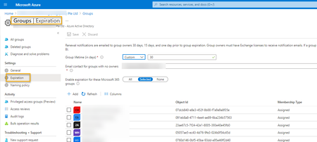 Hi all. I am doing group expiration at Azure portal as follows: I want to share all unused groups as Excel to the client. Through Get-AzureADMSGroupLifecyclePolicy, how can get all sel...