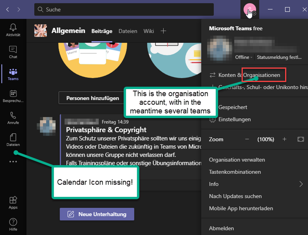 In der Teams for Business Version fehlt die Funktion in der linken Leiste "Kalender", so kann ich keine Besprechungen, die in der Zukunft liegen sollen, organisieren. Über Outlook kann ich leider auch keine Besprechung mit dem Team, aus dem von Microsoft Teams organisieren. Das Microsoft Teams AddIn in Outlook ist aktiv, aber es kommt eine Fehlermeldung das ich mich von Teams an und wieder abmelden soll. Wenn es dann noch nicht geht soll ich mich an den Support melden.