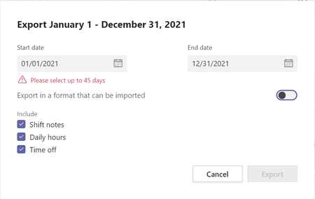 Hi everyone, Just found out today when trying to export my TEAMS SHIFTS schedule that the period available to export is now restricted to 45 days. Is this something permanent? We use S...