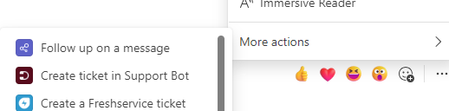 To clean up the "More Actions" section of the ellipsis (three dots) menu in Microsoft Teams, especially to remove entries added by third-party apps or integrations like ticketing systems and support bots, I think you'll need to manage or remove these apps from your Teams environment.