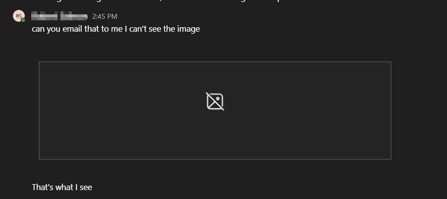 Hello ZachF10 Please take a look at the Best Response in this prior post and see if it solves your issue: image not visible in chat - Microsoft Tech Community