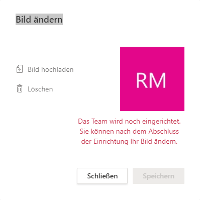 Wenn ich in Microsoft Teams Free auf "Team bearbeiten" gehe und dann auf "Einstellungen" und dort unter "Bild ändern" gehe, dann kann ich das Teambild nicht ändern. Da steht dann "Das Team wird noch eingerichtet. Sie können nach dem Abschluss der Einrichtung Ihr Bild ändern."
