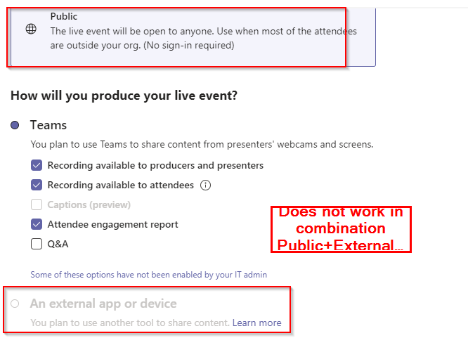 MS Live Events Public AND External App > not possible/supported. Why and are there solutions?