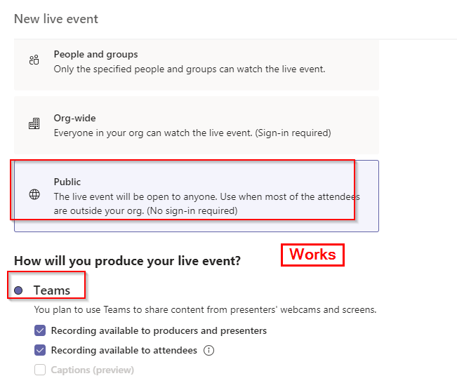 I have done tests with open broadcast system which has really great encoder features. But know the combination of "external app or device" AND Public is not supported. When I select external device the public is grey out. The policy for public is enabled and working with Teams Encoder.