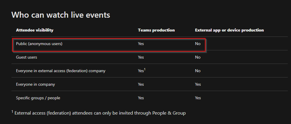 Marcel_Z Your findings are correct but even worse, when choosing the people and groups option then those people need to be licensed as well. So yes, it has been designed for internal people and should be more clear on the setup page. In most cases people will only realise this when the live event has already started and by then it is too late.