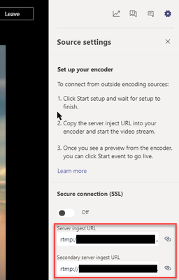 From my side, I will setup the Teams live as an Org > on the same page down below I will select an external application > and create. I will be the producer and I will invite someone else who will manage the Q&A (this part need to see how it works in case the moderator needs to be live as well). After setting up the Teams Live event now I need to get the rtmp url so that I can share with the vendor who will enter this url on OBS or Wirecast Pro. To get this url, I can open the Teams calendar > open the invite and join the meeting (without starting it live) then, I will be able to see the the urls as per picture below and copy the URL's. Another place to get it is to go to Microsoft stream > content > videos > setup code and get it from there as well.