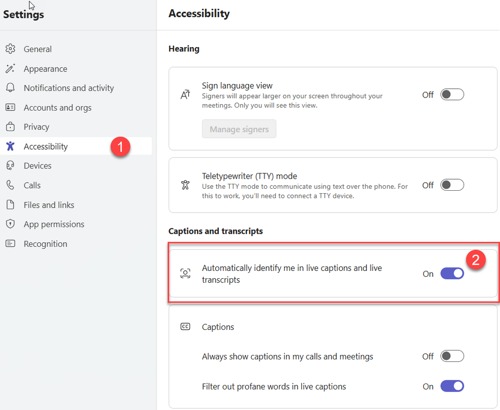 Then under Transcription, toggle on "Automatically identify me in meeting captions and transcripts"