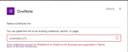 I have received a OneNote NoteBook URL of this shape: onenote:///\\foo.com\some\random\path\bar and I want to add it to a Teams group chat. However I get the below error: Only not...