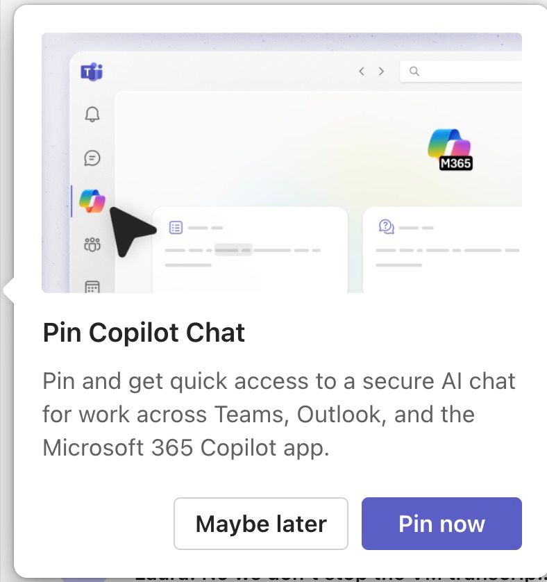 Can somebody tell me how to disable the annoying "Pin Copilot Chat" popup? every morning I have to say "Maybe Later" when I really mean to say NEVER IN A THOUSAND YEARS