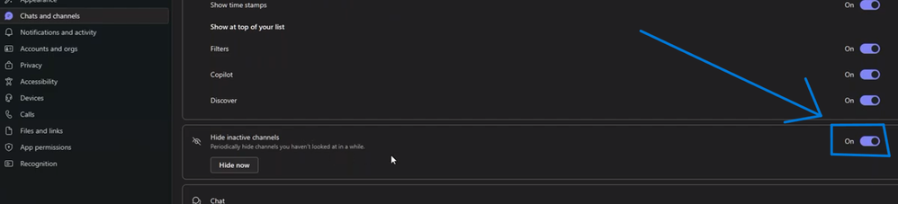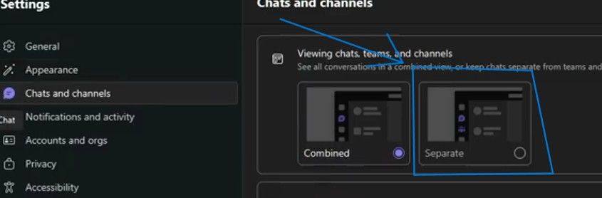 1- Settings → Chats and channels, then select Separate under the "Viewing chats and channels" option.