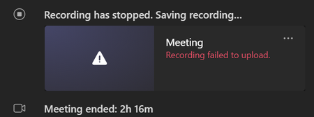 A colleague recently created a meeting and recorded it. However, when they stopped the recording, we got the following: The recording seems to have been lost. It is not there on the c...