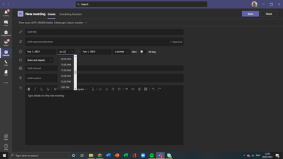 gunwin1Copper ContributorJan 30, 2021Setting time for meetings in MS TeamsI'm trying to set specific times for meetings in my calendar but the time reverts back to whatever it was before. I've re-started and it has made no difference.