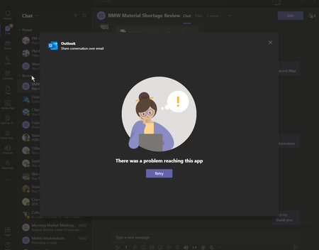 Hi I am having issues of sharing my channel messages to outlook today. I am getting error message of "There was a problem reaching this app“ Can anyone pls help? Thanks Ryan
