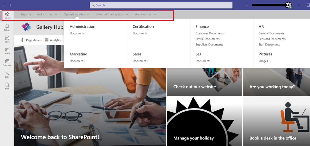 Hi. I have added my SharePoint Hubsite to the MS Teams main menu, as an App, using Viva Connections. This allows my users to access their SharePoint sites (where we keep most of our docs) direct from within Teams. The Hubsite tool bar contains links to all my team sites and their document libraries. Like so....